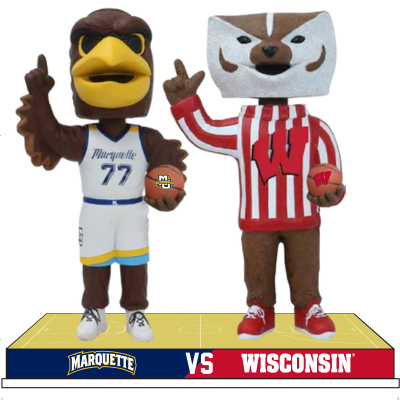 This bobblehead celebrates the Marquette vs. Wisconsin Basketball Rivalry and features Marquette's mascot Iggy and Wisconsin's mascot Bucky Badger. The bobblehead commemorates the in-state rivalry which has been played annually since 1958 and first played in 1917. It is officially licensed by Marquette University and the University of Wisconsin.