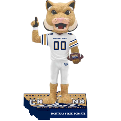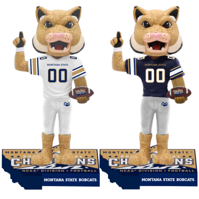 These bobbleheads celebrate the Montana State Bobcats' 2025 FCS Football National Championship. The bobbleheads feature Champ, the official mascot of Montana State University. On Monday, January 5th, 2026, the Bobcats became National Champions and captured their 2nd National Championship in program history when they defeated Illinois State in Nashville, Tennessee. The navy jersey bobblehead will be updated to reflect the jersey worn during the National Championship game. They are officially licensed by Montana State University.