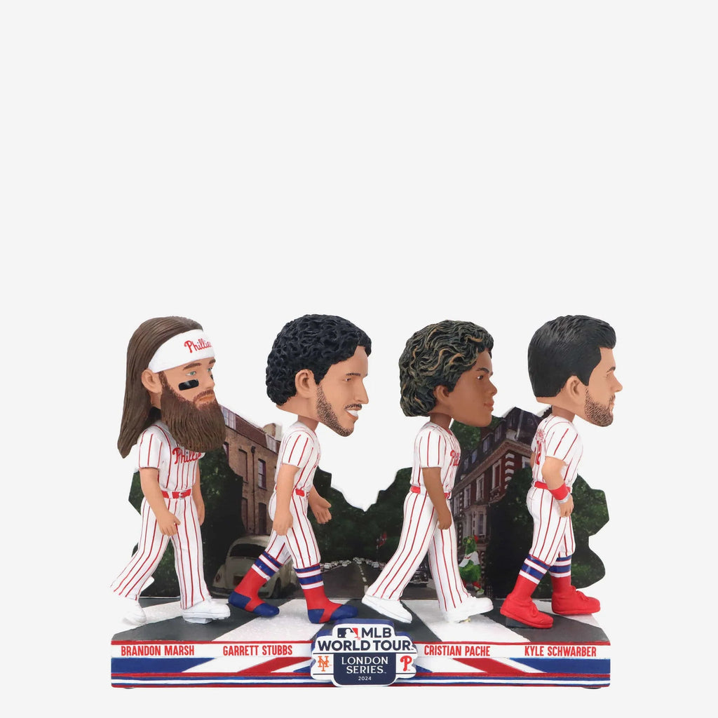 Order your Brandon Marsh, Garrett Stubbs, Cristian Pache & Kyle Schwarber Philadelphia Phillies 2024 MLB London Series Abbey Road Mini Bobblehead Scene MLB Baseball Bobblehead before it's too late. A very limited quantity are available for this new arrival, so don't miss out!